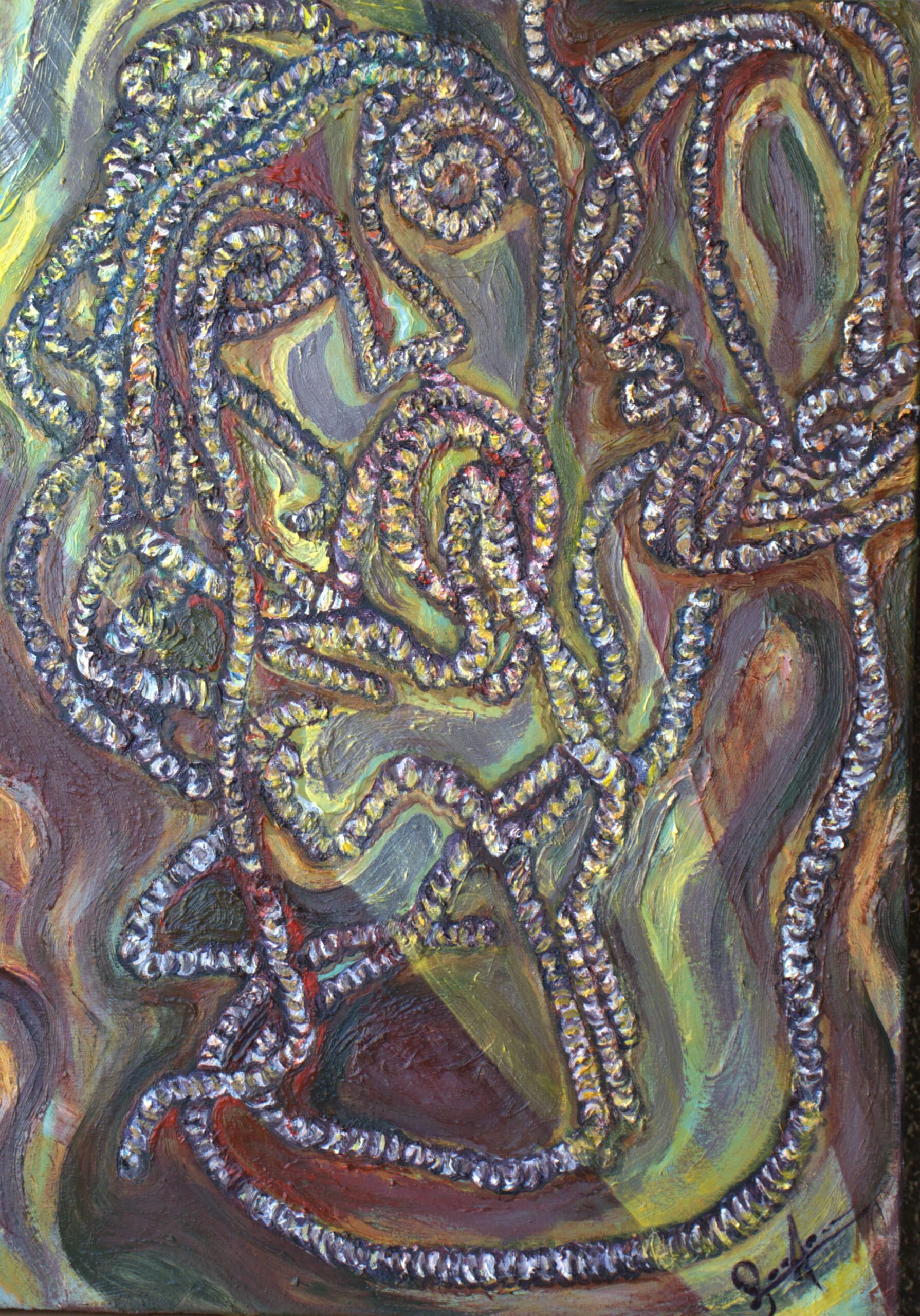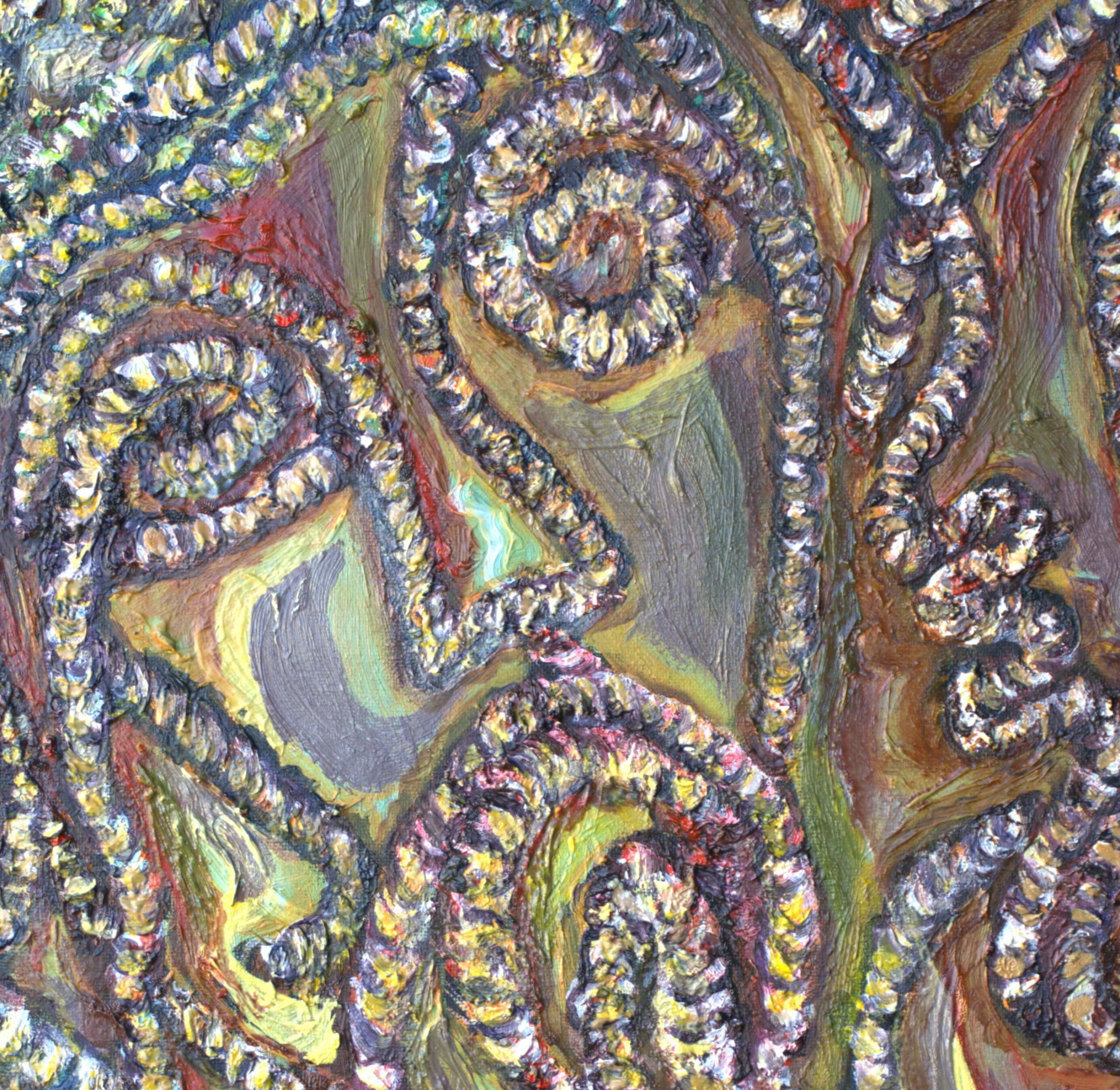 This painting is an oil painting on cotton canvas. The artist has pushed the boundaries of figuration, almost bordering on abstraction. A play of earthy colors is used, contrasting them with bright greens and yellows to enhance the theme the artist seeks to depict in this painting.