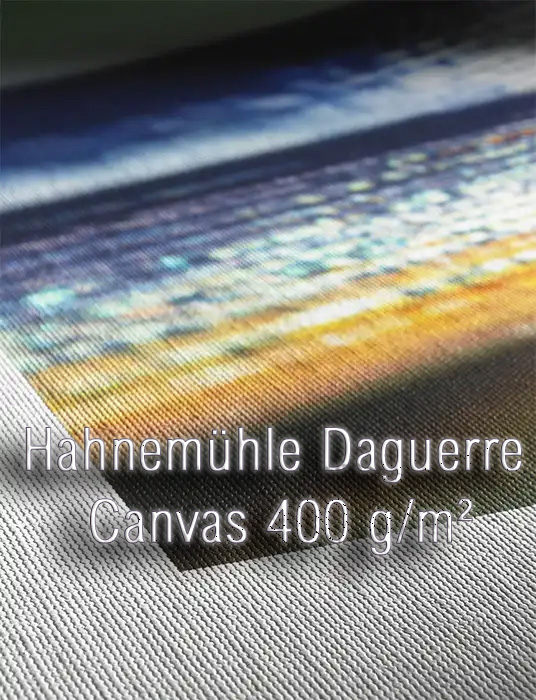 Hahnemühle Daguerre Canvas, 400 g/m², is a polycotton canvas for inkjet printers. It has a matte finish.