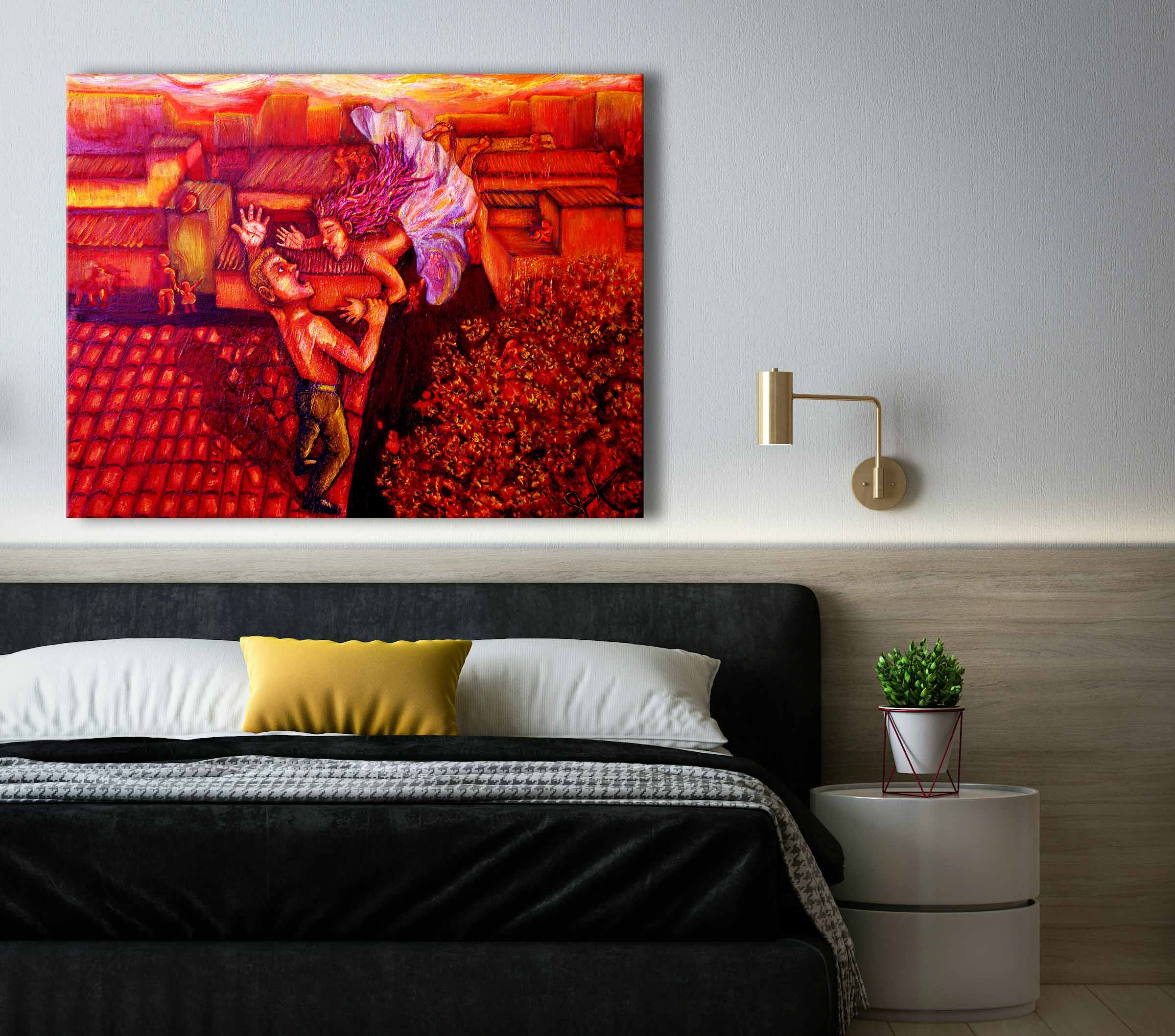 Just Let Me Go! is the contradiction and crossroads when a relationship ends. The painting reflects the attachments and decisions at different stages of our lives, taking us on a journey through feelings of love, trust, betrayal, loneliness, and more. The interpretation is left to the viewer’s imagination.